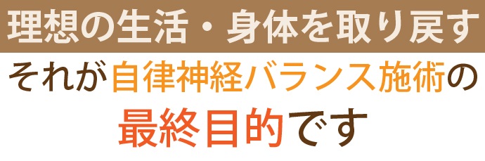 しかしご安心ください。その原因不明の症状、改善しない不定愁訴は「自律神経バランスの乱れ」が原因である可能性が高く、自律神経バランスを整えていけば、もう悩まない身体に目指せます!