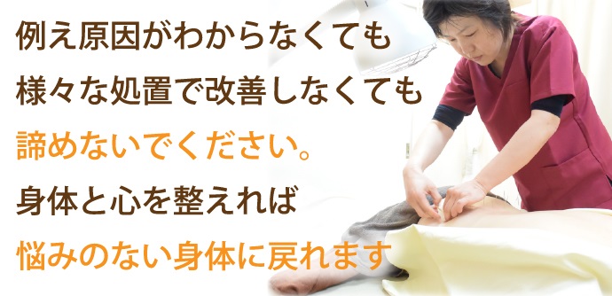 原因が不明だったり、様々な治療で治らなかったりすると、改善自体を諦めてしまう方が多いです。しかし、諦めないでください。